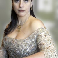 Rosa Moreno de Castro, pintora jaenense residente en Madrid, ha hecho un retrato de Maristela Gruber, representada como “Gran dama en verde”, donde luce joyas de familia. La soprano brasileña es de origen austríaco alemán y portugués.