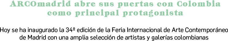 En total 10 son las galerías colombianas que exponen, desde hoy y hasta el próximo uno de marzo, en los pabellones 7 y 9 de IFEMA. Además, y gracias a los programas Focus Colombia y Colombia en Madrid, el público podrá disfrutar de un despliegue sin precedentes del arte colombiano con veinte exposiciones y un amplio programa de actividades talleres y performances durante los meses de marzo y abril.