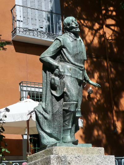 12/8/23.- El Escorial .- Crispín, el personaje pícaro de la célebre obra teatral “Los intereses creados” del premio Nobel español 1922, Jacinto Benavente, cuenta con un monumento en la céntrica plaza de Jacinto Benavente (1948) en San Lorenzo de El Escorial, “los jardincillos”, que llamamos. No deben de ser muchas las villas o ciudades que dediquen “homenaje” a un pícaro, pero no debiera ser tan extraño, pues la novela picaresca, que concede el protagonismo a un pícaro está presente en la literatura española, desde el anónimo “El Lazarillo de Tormes” a “El Buscón Don Pablos” de Francisco de Quevedo. No sé si ese protagonismo del pícaro como personaje se debe a su no infrecuente presencia en sociedad. (El Lazarillo también tiene su monumento en Salamanca).
